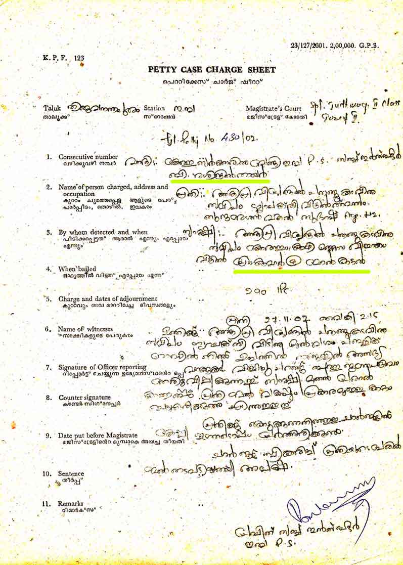 | 6 | വീട്ടിൽ അതിക്രമിച്ച് കയറി ആക്രമണം | 13.4.2007 ന് ഉത്സവത്തിന്റെ മറവിൽ എന്നെ മന:പൂർവ്വം ദ്രോഹിക്കാൻ വേണ്ടി എന്റെ വീടിന് മുന്നിൽ ഉച്ചഭാഷിണികൾ കൊണ്ടുവന്ന് അടുക്കി വയ്ക്കുകയും, അത് എന്റെ വീട്ടിന് മുന്നിൽ നിന്ന് മാറ്റണമെന്ന് പറഞ്ഞപ്പോൾ ഗുരുകുമാറിനോടൊപ്പം വന്ന ശ്രീറാം രതീഷ് എന്നോട് 2 ദിവസം സഹിച്ചേ പറ്റൂ അല്ലെങ്കിൽ സഹാറാ മരുഭൂമിയിൽ പോയി ഒറ്റയ്ക്ക് താമസിച്ചോളാൻ പറയുകയുമാണ് ചെയ്തത്, അതിനാൽ പോലീസിൽ പരാതി നൽകുകയും തുമ്പ പോലീസ് എത്തിയെങ്കിലും നിയമാനുസൃതമായ യാതൊരു നടപടിയും സ്വീകരിക്കാത്തതിനാൽ ശംഖുമുഖം ACP ക്ക് പരാതി നൽകുകയും, വൈകുന്നേരം ഉച്ചഭാഷിണികൾ മാറ്റുകയും ചെയ്തു. അതിന്റെ പ്രതികാരമായി ഉത്സവം കഴിഞ്ഞ് 15.4.2007 ന് സംഘം ചേർന്ന് എന്റെ വീട്ടിൽ അതിക്രമിച്ച് കയറി ആക്രമിച്ചു. ഉടൻ പോലീസിനേയും ബന്ധുക്കളേയും അറിയിക്കുകയും മെഡിക്കൽ കോളേജ്, കാഷ്വാലിറ്റിയിൽ പ്രവേശിപ്പിക്കുകയും മുറിവുകളിൽ തയ്യൽ ഇട്ട് പിറ്റേ ദിവസം വിടുകയും ചെയ്തു. കുറ്റക്കാർക്ക് സഹായി ആയി നിന്ന അന്നത്തെ SI. പൃധ്വിരാജ് എന്റെ മൊഴി എടുക്കാനോ FIR രജിസ്റ്റർ ചെയ്യാനോ തയ്യാറായില്ല. അതിനാൽ 17.4.2007 ന് ബഹു. മുഖ്യമന്ത്രിക്ക് പരാതി സമർപ്പിച്ചു. 24.4.2007 ന് എന്റെ പരാതി സിറ്റി പോലീസ് കമ്മീഷണർക്ക് അയക്കുകയും, അവിടെ നിന്നും മെഡിക്കൽ കോളേജ് CI ക്ക് അയക്കുകയും അവിടെ കുറ്റക്കാരെ വിളിപ്പിച്ചപ്പോൾ വിവിധ രാഷ്ട്രീയ പാർട്ടികളിൽ നിന്നും കുറ്റക്കാരെ രക്ഷിക്കാൻ ആൾക്കാർ എത്തി, ഒരു കുറ്റവും ചെയ്യാത്ത എന്നോടൊപ്പം നിൽക്കാൻ മാത്രം ആരും ഉണ്ടായിരുന്നില്ല. രാഷ്ട്രീയ പാർട്ടിക്കാരും CI യും ഒത്തുതീർപ്പാക്കാൻ വലിയ ശ്രമം നടത്തിയെങ്കിലും ഞാൻ വഴങ്ങിയില്ല, അങ്ങനെ മനസ്സില്ലാമനസ്സോടെ തുമ്പ SI പൃധ്വിരാജിന് ഷമ്മി, ശ്രീകാന്ത് @ കുഞ്ഞുമോൻ, ശ്രീജിത്ത് @ കൊച്ചനി എന്നിവർക്കെതിരെ FIR 72/2007 |